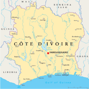 Côte d’Ivoire is bounded to the north by Mali and Burkina Faso, to the east by Ghana, to the south by the Gulf of Guinea, to the southwest by Liberia, and to the northwest by Guinea.